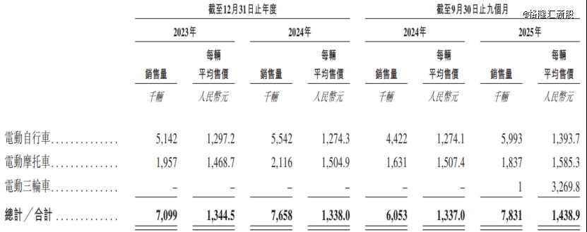 其中,2023年至2025年前三季度,公司的每辆电动自行车平均售价从1297.2元增加至1393.7元,每辆电动摩托车平均售价由1468.7元增加至1585.3元。