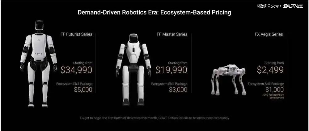 其中,全尺寸人形机器人Futurist(未来主义者)系列被FF定义为“职业型具身智能人形机器人”定价34990美元起(约合人民币24.2万元),另外还可选装生态技能包价格为5000美元。