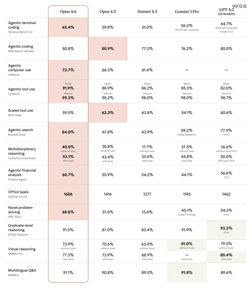在代码能力方面,Opus 4.6在Terminal-Bench 2.0这个评测中拿到了最高分。