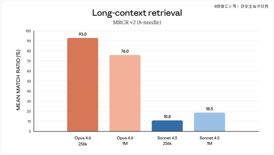 而这次,Claude Opus 4.6,在MRCR v2的测试上做了实验,这个测试是大海捞针类的,就是在一大堆文本里藏几个关键信息,看模型能不能找到。