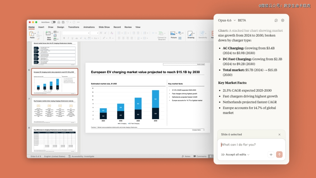 将Claude集成到了PowerPoint侧边栏中,让它在创建新内容之前读取现有的布局、字体和母版。