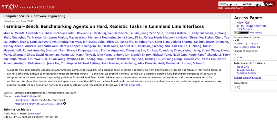 唯 一一个对齐的基准是Terminal-Bench 2.0,这是一个由89个复杂真实任务组成的基准,这些任务都在终端环境中执行,每个任务运行在独立Docker容器内。