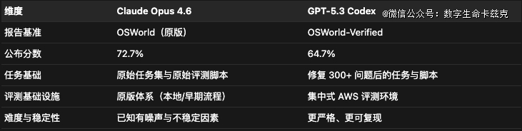 关键区别在于,Claude Opus 4.6报告的是原版OSWorld(72.7%),而 GPT-5.3 Codex报告的是OSWorld-Verified(64.7%)。