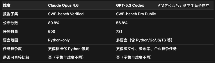 所以说,Claude Opus 4.6在Verified的80.8%与GPT-5.3 codex在Pro Public的56.8%不能直接比较。