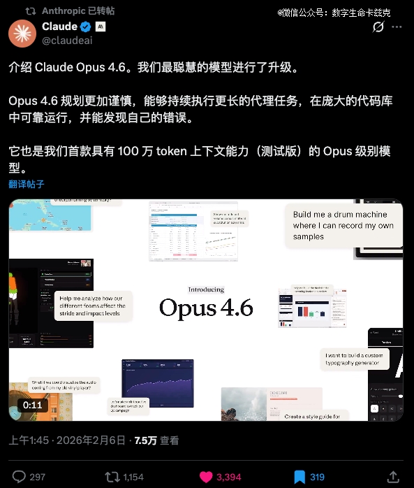 Anthropic的新模型Cluade Opus 4.6正式更新了。