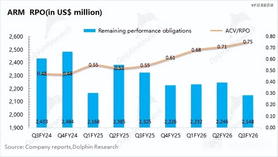 综合以上三项指标来看,ARM 虽然仍保持着 20%+ 的增长,但经营面也出现了一些隐患:①下季度版税收入增速大幅回落;②剩余未完成订单(RPO)再次出现下滑。