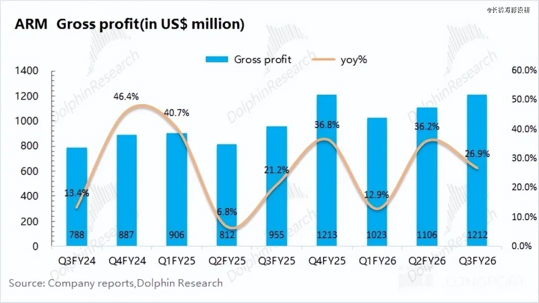 1、主要数据:Arm 本季度实现收入 12.4 亿美元,同比增长 26%,符合市场预期(12.3 亿美元)。公司本季度收入端环增的 1 亿美元中,主要来自版税业务的增长贡献。公司毛利率为 97.6%,维持在 97% 以上的高位。