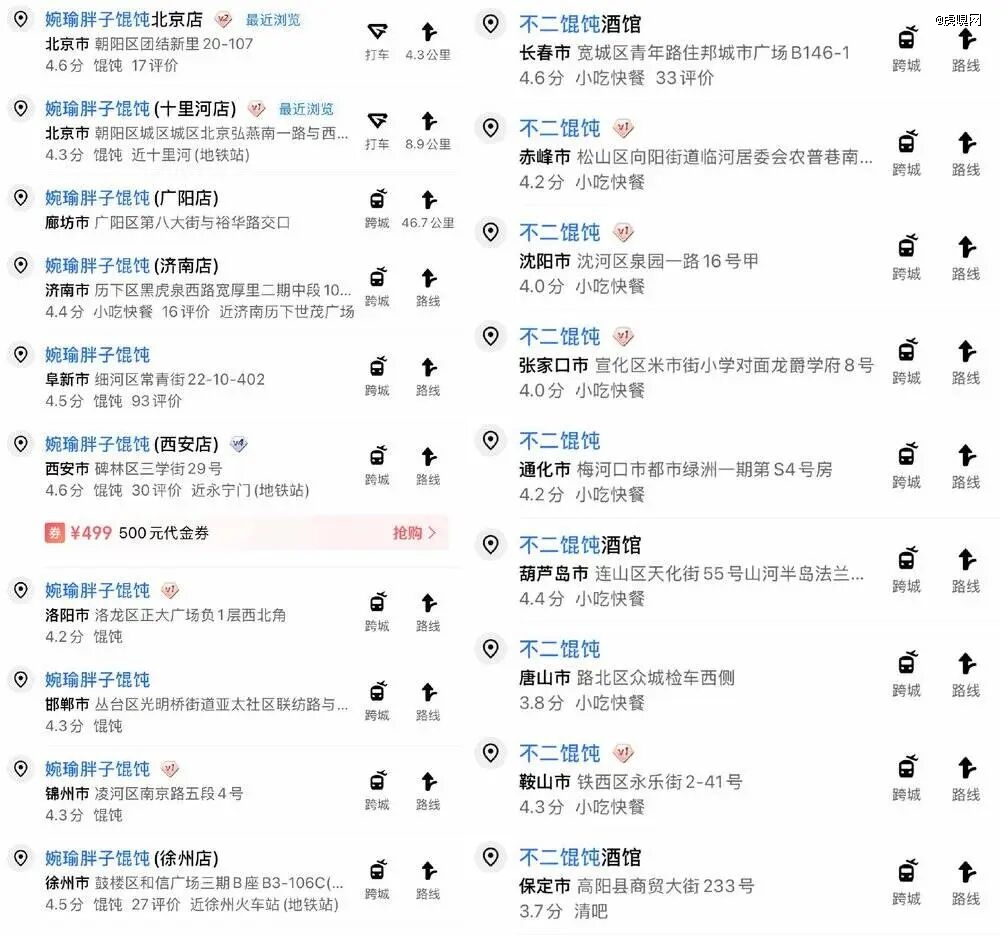 在地图软件搜索,“婉瑜胖子馄饨”不仅从山东开到了东北,还在河北廊坊、河北邯郸、河南洛阳、陕西西安、浙江杭州、江苏徐州等城市都设有据点,甚至连北京都开了两家门店。