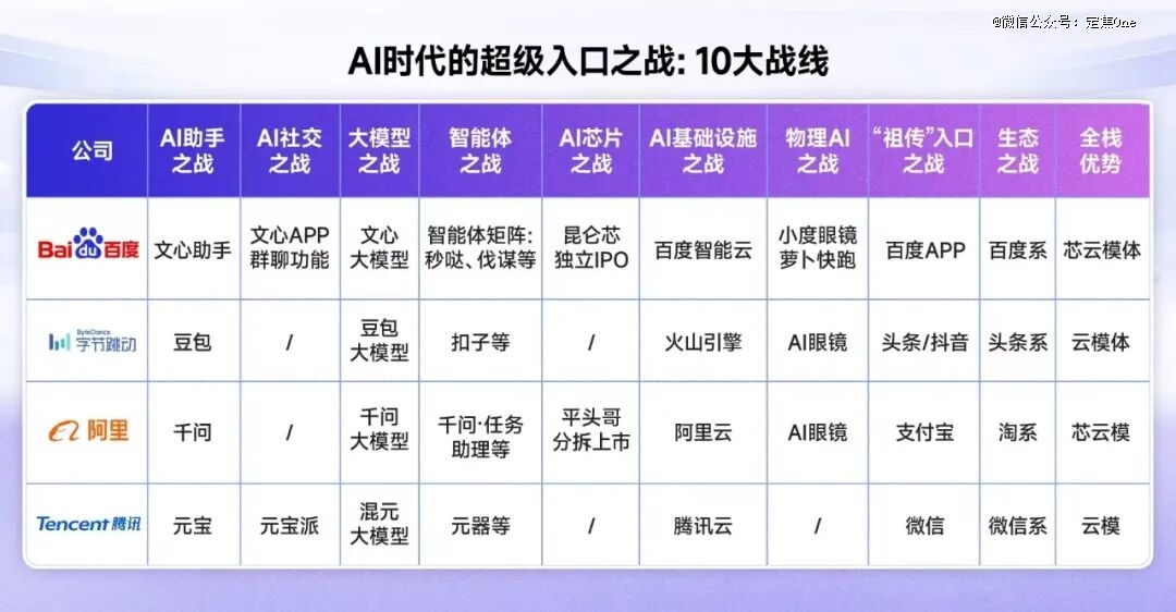 最终,可能不是某一个AI App“一统天下”,而是“万物皆Agent”,无论是社交软件、电商平台,还是办公套件,都深度整合了AI Agent(智能体)的能力。入口不再是一个需要被记住的位置,而是一种随时被调用的能力。到那时,大厂之间的竞争将集中在三个维度。