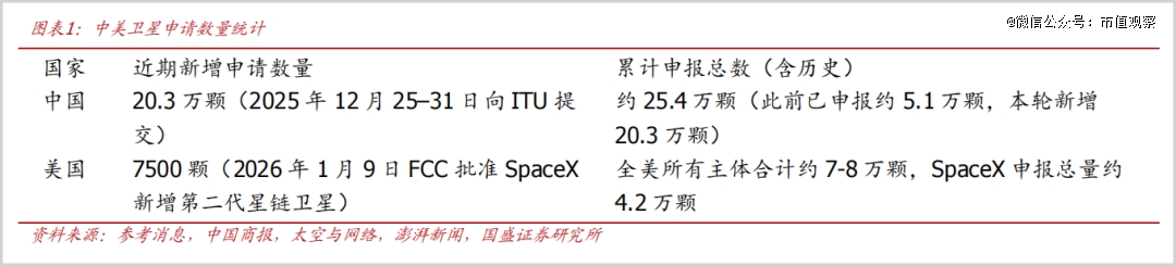 同时,国内正在同步推进三个万星级别的互联网卫星星座计划,包括远景规划总卫星数量达1.3万颗的GW星座(国网星座)、1.5万颗的“千帆”星座和1万颗的“鸿鹄-3”号星座,这三大互联网卫星星座总数超过4万颗。相关主体在2025年12月再次新增20.3万颗卫星申请,组网节奏明显提速。