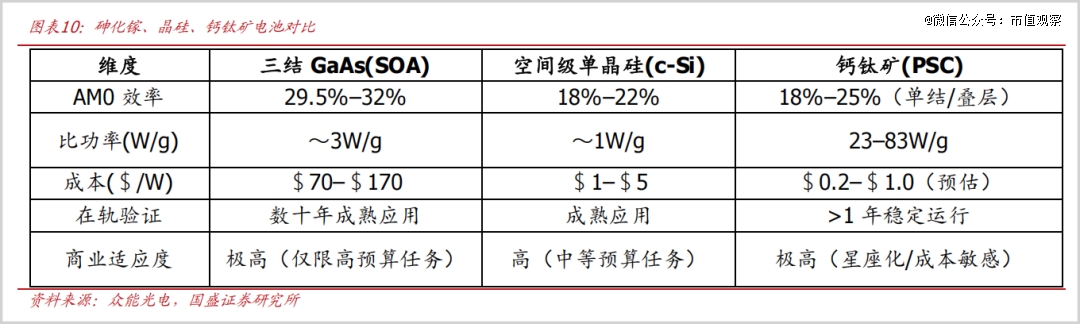 据国盛证券研究,钙钛矿叠层电池的最高实验室效率约35%,预估成本不足7元每瓦,较砷化镓电池显著下降。