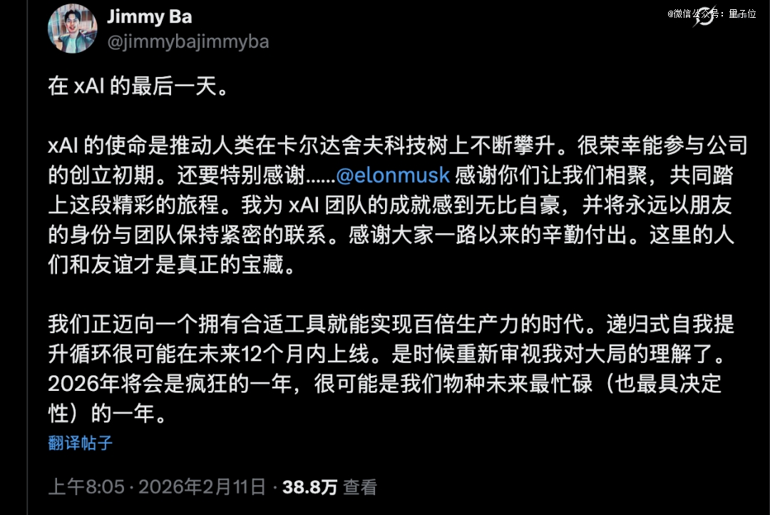 他在离职声明中感谢了马斯克,并称2026年将是”人类未来发展史上最繁忙(也*决定性意义)的一年”。