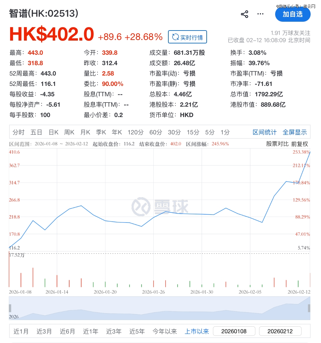 此前,在OpenRouter市场上发布的开源模型Pony Alpha(实际上是智谱的新模型GLM-5)就曾引发智谱股价上涨,2月9日单日涨幅达36.22%。双重消息刺激下,直接推动智谱股价在2月12日盘中,一度涨超41%报443港元,对应市值达1975.60亿港元,逼近2000亿大关。截至收盘,智谱股价仍涨28.68%报402港元,总市值1792亿港元。