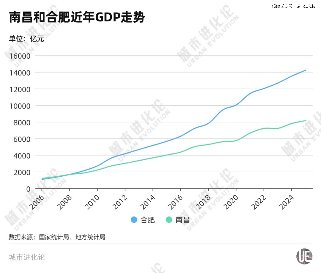 根据国家统计局数据,南昌和合肥在2006年还是一个档次的城市,南昌GDP为1183亿元,合肥为1073亿元,南昌比合肥还高出一截。但到2025年,合肥GDP为14210亿元,经济体量已是南昌的1.75倍。