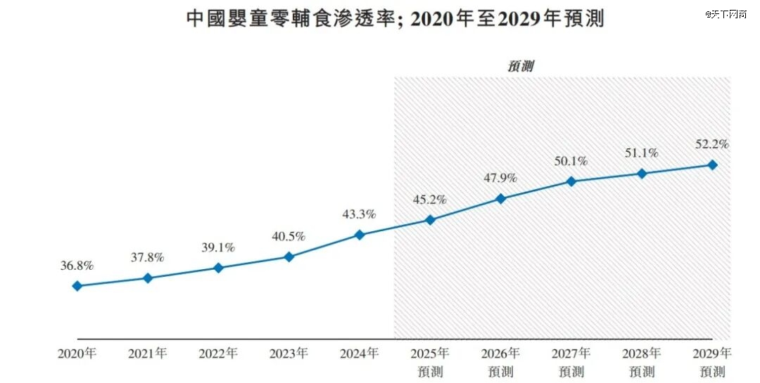 数据显示,6个月至6周岁婴童的零辅食渗透率已从2020年的36.8%,提升至2024年的43.3%,预计到2029年达到约52.2%。市场规模也从2020年的362亿元增长到了459亿元,预计2029年有望突破600亿元。