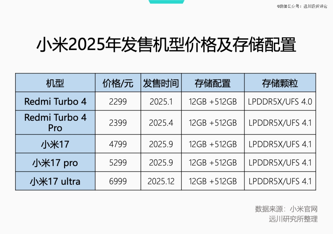 小米去年10月推出的Redmi K90系列新款,标准版较上一代上涨300元,其中12GB+256GB规格和12GB+512GB两种存储规格之间的价差达到600元。