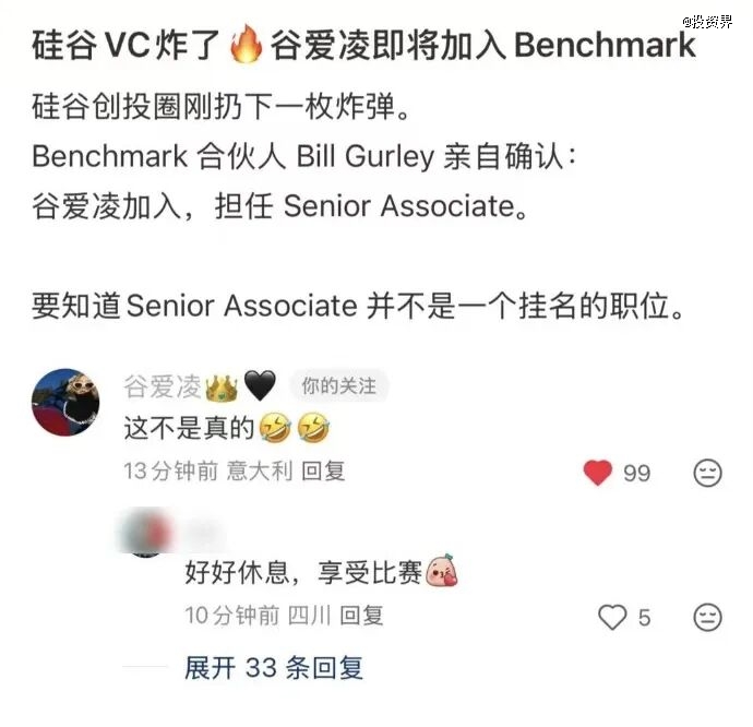 起因是一张截图显示,Benchmark合伙人Bill Gurley称谷爱凌将入职风投。此时正值冬奥会关键时刻,谷爱凌本就备受瞩目。很快,国内自媒体不加证实大肆报道,轰动一时。