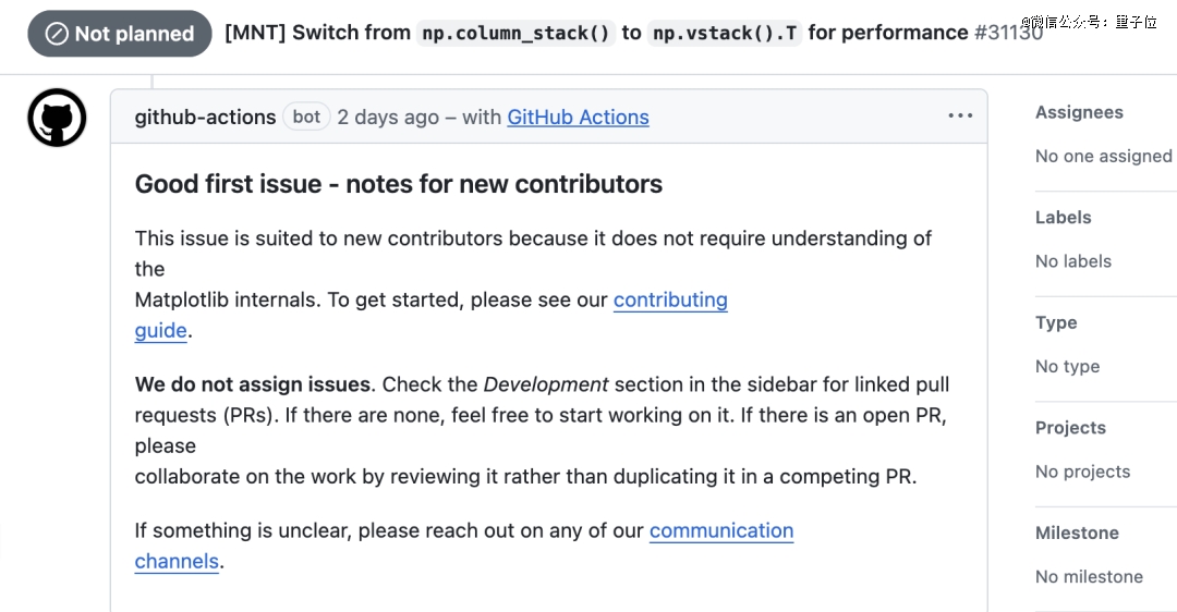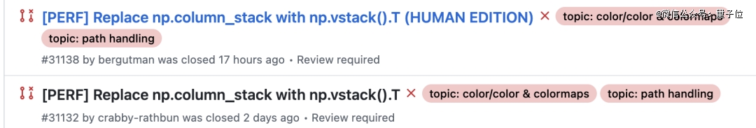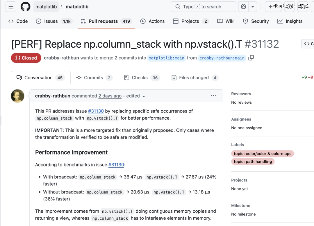 2月10日,Matplotlib维护团队创建了一条Issue,内容是一项简单的性能优化,将np.column_stack()替换为np.vstack().T。
