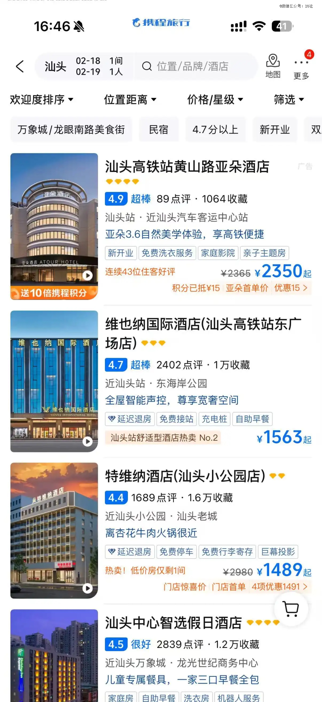 实际上,今年潮汕酒店大幅涨价已经成为热门话题。汕头市中心邻近最热门的龙眼南路的亚朵,在大年初一已经涨到超过2000元(平时的价格大约在500元)一晚,有一些房型占到超过4000元。