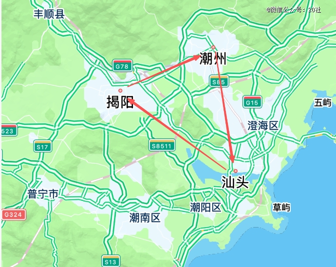 地图上,三个城市构成了一个很紧凑的三角形。从潮州出发到汕头40多公里,从汕头到揭阳50多公里,揭阳到潮州只有30公里,总里程也不到150公里。不下车的话,自驾一天能转好几圈。