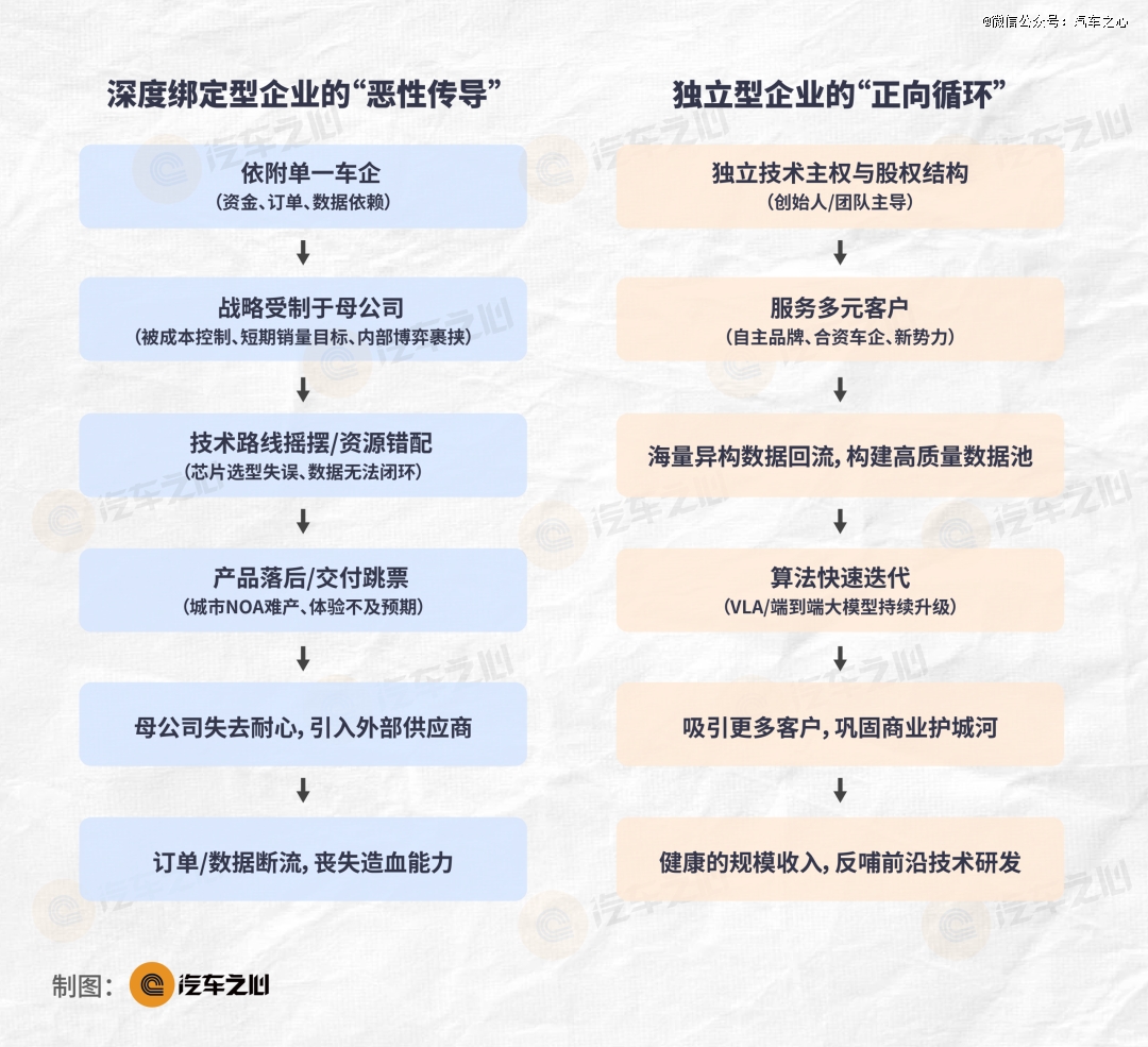 「独立智驾公司」不再是加分项,反而成了高风险选项,行业也逐渐形成了共识:不抱车企的大腿,基本走不到终局。