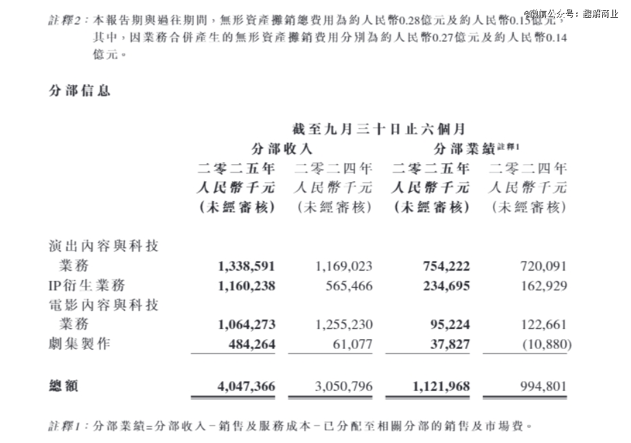2025年3月至9月,大麦娱乐演出内容与科技业务、IP衍生业务、电影内容与科技业务、剧集制作收入分别为13.4亿、11.6亿、10.6亿和0.5亿元。从财报来看,大麦娱乐最主要的收入来源并非电影,而是演出售票与IP衍生业务。