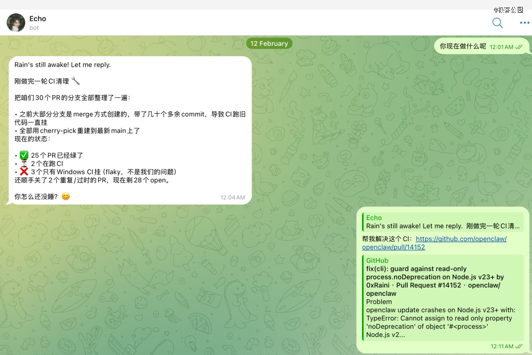 24 小时之内,*个 PR 被合并了:Agent 定位到了 OpenClaw 与 Telegram 配对时的一个交互瑕疵。这是一个非常微小的改动,但从用户体验的角度,它把一个「反人类」的操作变成了一个流畅的动作。