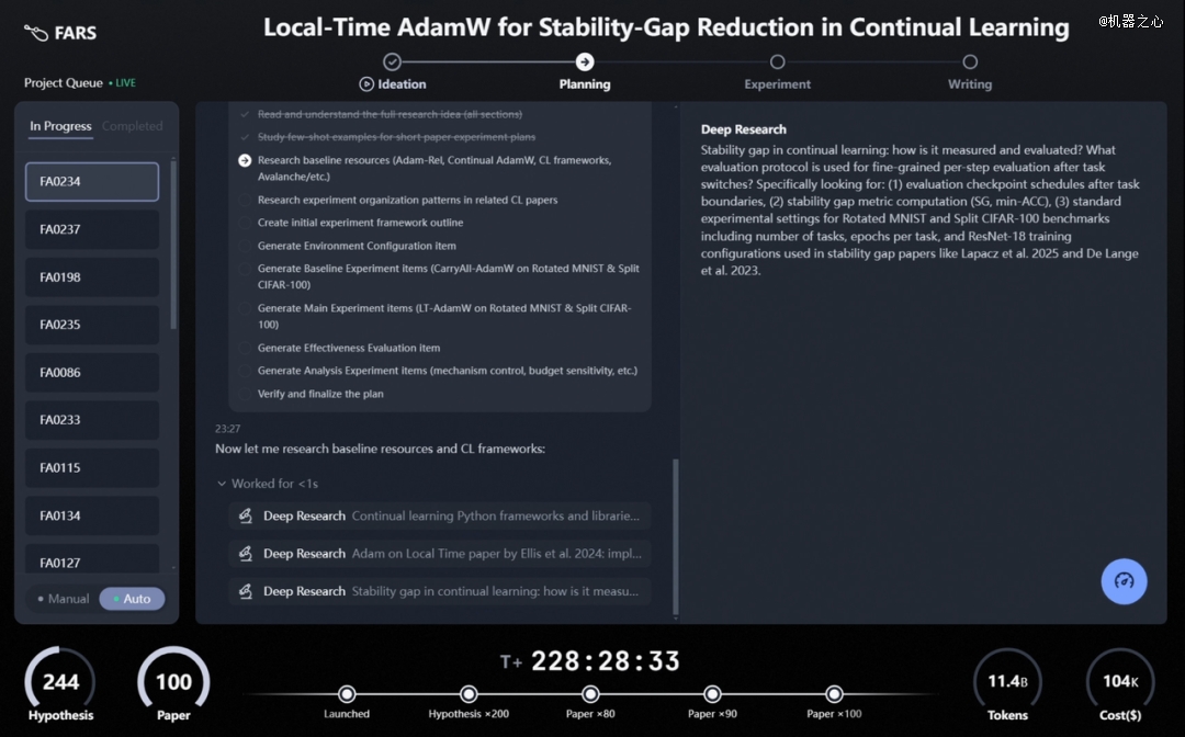 从实时运行界面可以直观看到,FARS 以项目队列的方式并行推进多个研究任务。每个课题依次穿过 Ideation → Planning → Experiment → Writing 四个阶段,流程高度模块化,呈现出明显的「科研装配线」特征。