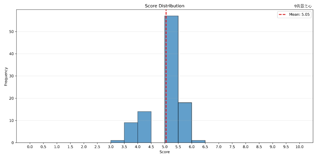 从整体评分结果来看,FARS 产出的 100 篇论文中,平均得分为 5.05(区间 3.0–6.3)。