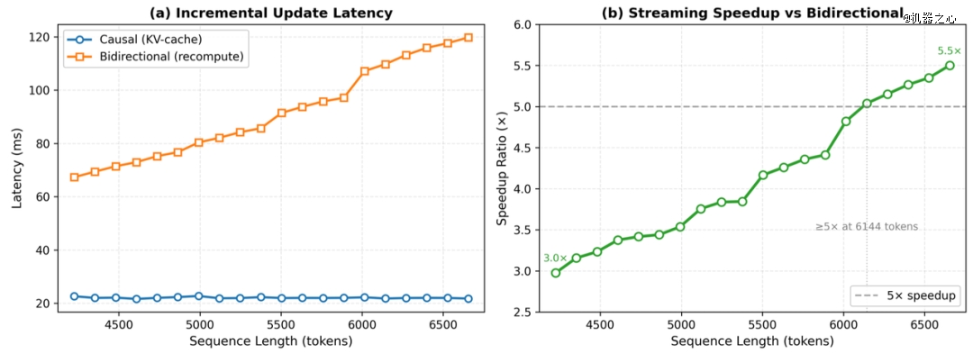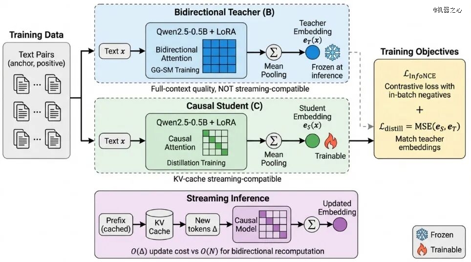 双向注意力质量高,但会破坏 KV-cache;因果注意力能流式推理,但表示能力吃亏。