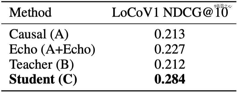 LoCoV1 长文档检索结果。student 模型以 0.284 的 NDCG@10 大幅*所有 baseline(包括 teacher 的 0.212 ),出人意料。
