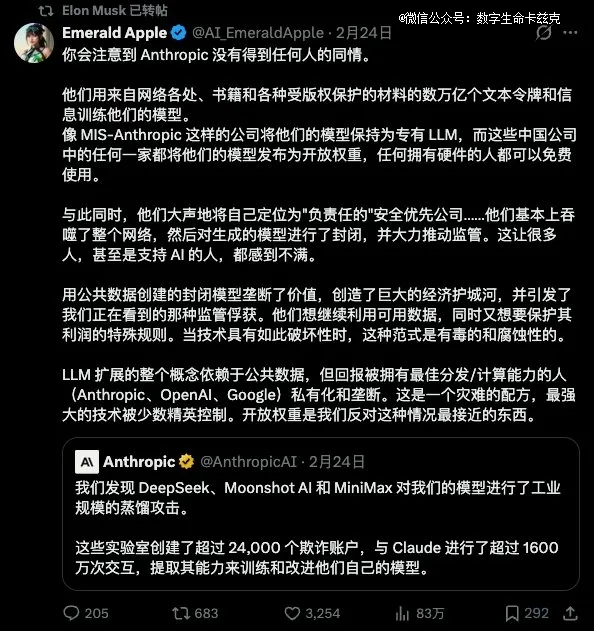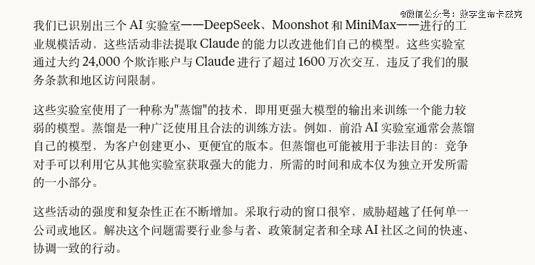 内容大意是说,他们发现了三家中国AI公司,分别是DeepSeek、Moonshot(就是Kimi的母公司)和MiniMax,对Claude进行了"工业规模的蒸馏攻击"。