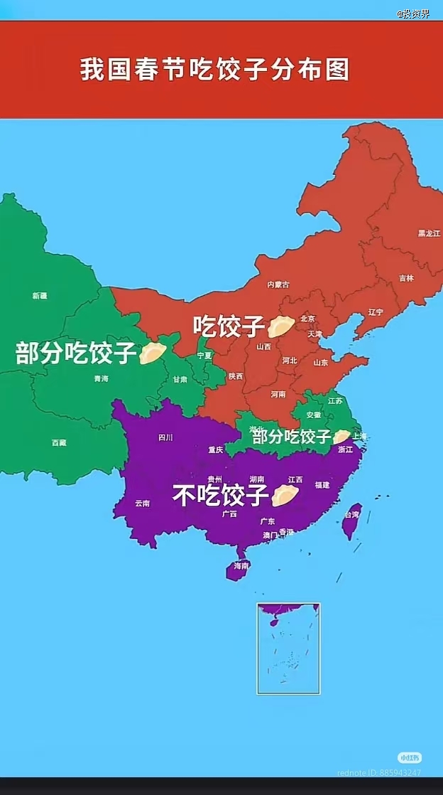 一张地图诠释了年味的地域差别:以湖北、安徽、江苏、上海四个部分吃饺子的省份为界,其东北区域过年吃饺子是传统,以南最初是不吃饺子的,西北五省则是有吃有不吃。