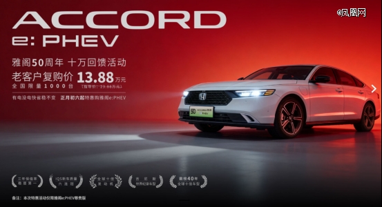 广汽本田近日宣布,为庆祝雅阁50周年,老客户复购雅阁e:PHEV车型,仅需13.88万元,较官方指导价直降10万元,创下上市后最高降价纪录,限量1000辆。