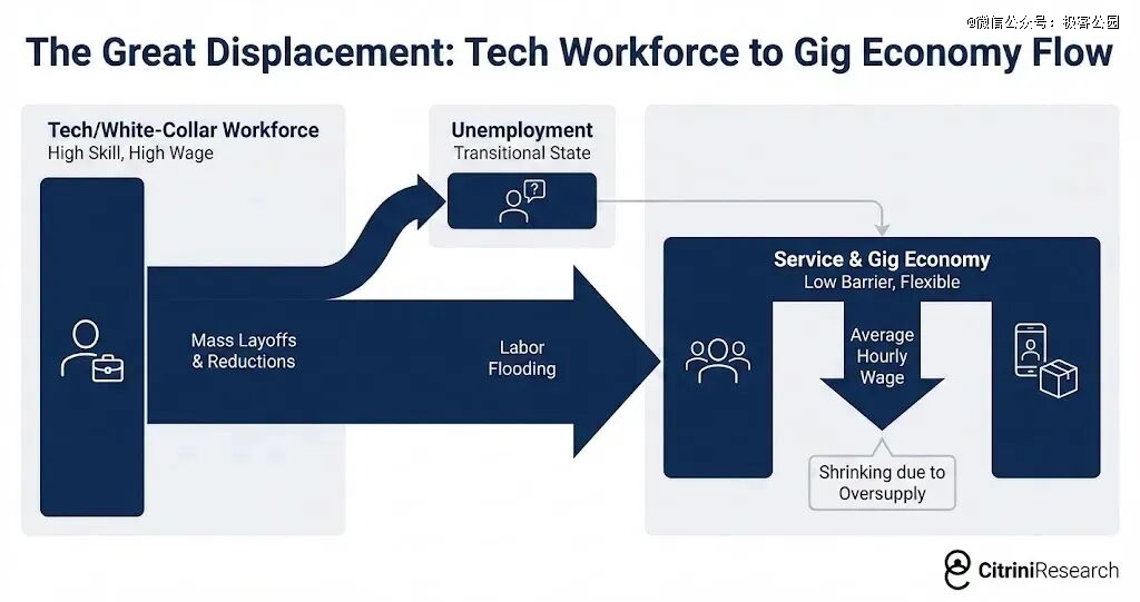 上图体现了劳动力市场的流向及其后果。高技能、高工资的科技/白领阶层经历「大规模裁员」后,通过失业过渡,涌入准入门槛低的「服务与零工经济」。