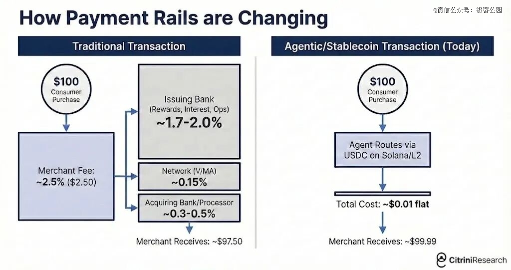 而在智能体/稳定币交易 (Agentic/Stablecoin Transaction):AI 智能体通过 Solana 或 L2 上的 USDC (稳定币) 自动路由支付,成本降至 0.01 美元 固定额度。商户实收约 99.99 美元。