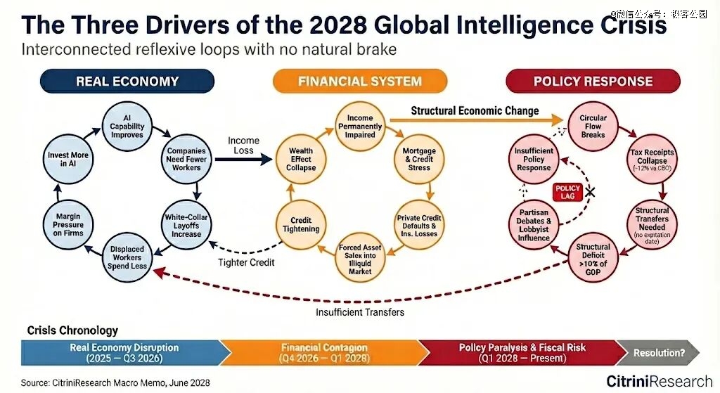 这个综合逻辑图里,展示了三个系统的相互激发:实体经济里,AI 提升导致白领裁员,直接造成收入损失;金融系统中,收入损失引发财富效应崩溃、信用紧缩、房贷违约以及私人信贷违约,最终被迫在流动性极差的市场抛售资产;然后是政策响应,由于税收崩溃(人不再产生收入,政府收不到税)和党派争论,政策反应滞后,导致结构性赤字超过 GDP 的 10%。