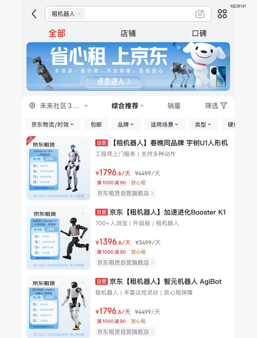 与此同时,不同类型机型的价差也十分显著。一些面向普通消费者的机器狗,日租金已低至399元;用于足球表演赛等专业场景的机器人,由于技术要求和调试成本更高,日租金可超过2万元;在京东上春晚同款宇树U1人形机器人日租金仅1796元。