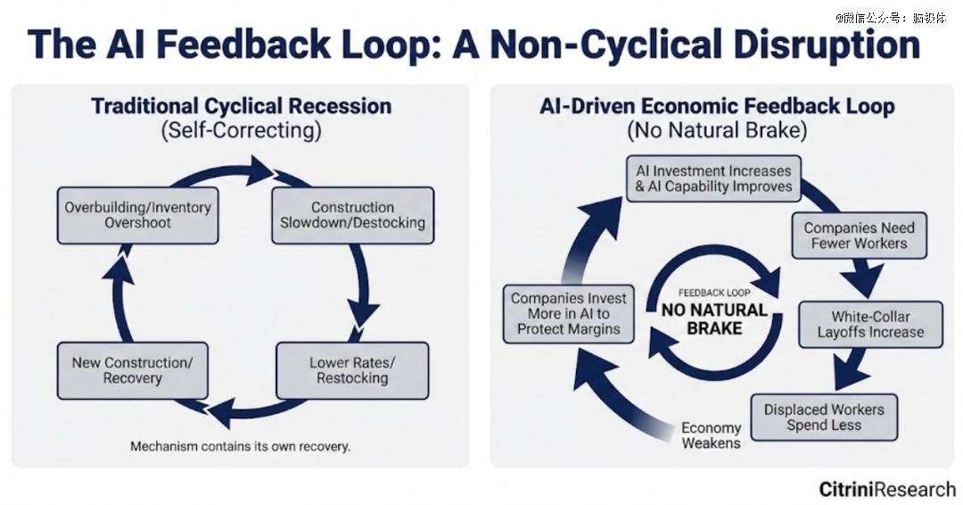 这次的起因,是2026年2月23日,美国一家独立研究机构Citrini Research 发布了名为《2028 年全球智能危机》(以下简称《智能危机》)的报告。这篇报告(或者说是经济推演),在极短时间中完成了病毒式传播,直接引发了美股科技股集体暴跌。在国内社交媒体上也得到了迅速发酵,引起剧烈讨论。