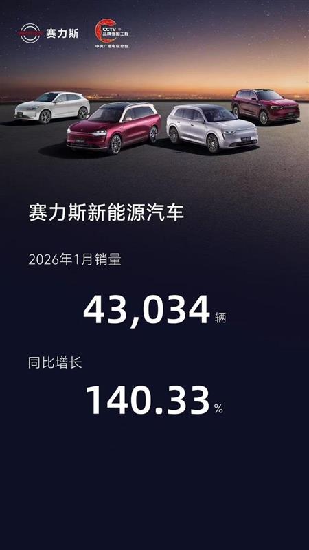 2月1日,赛力斯发布2026年1月产销快报。数据显示,赛力斯新能源汽车1月销量43,034辆,同比增长140.33%。旗下高端品牌问界表现尤为亮眼,1月新车交付40,016辆,同比增长83%。同时,问界也于当月迎来了第100万辆整车下线,再次刷新中国新能源汽车市场的交付速度纪录。