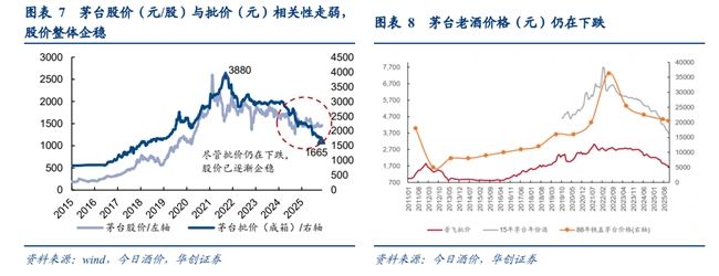 库存与价格体系优化:行业处于主动去库存末期,头部酒企通过控量保价策略稳定价盘;茅台批价回升至1600元以上,对行业价格体系起到锚定作用。