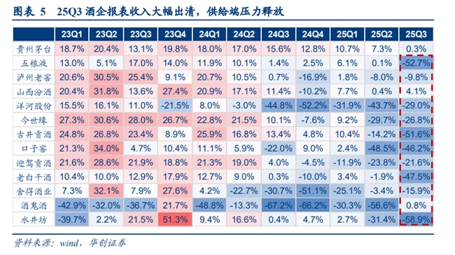 过去几年行业供需持续错配,2025年中消费场景受损导致供需全面失衡,但 2025Q3 头部酒企报表压力加速释放,“报表-动销”差额开始收敛,供需拐点已现。具体看:供给端,上市酒企严控供给聚焦纾压,25Q3 头部上市酒企营收、利润分别同降 18.4%、22.0%,其中茅台、汾酒务实降速,五粮液、古井报表加速出清,下滑幅度超 50%,其余酒企亦有不同程度下滑。需求端,伴随消费场景逐步修复,终端动销环比年中已有明显改善。供需缺口边际反转,经销商库存加速去化。展望来看,预计 Q4 至明年 H1 酒企报表延续出清节奏,经销商历经四个季度去库后,持续观察供需再平衡时点。
