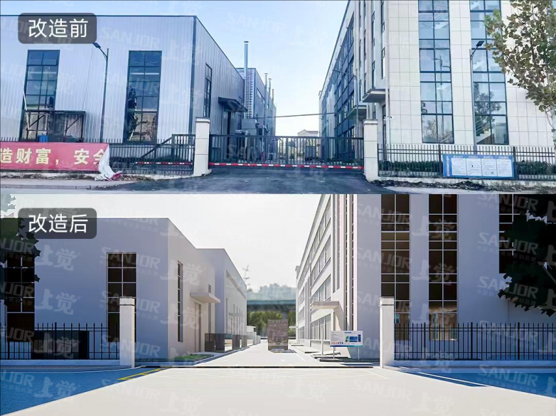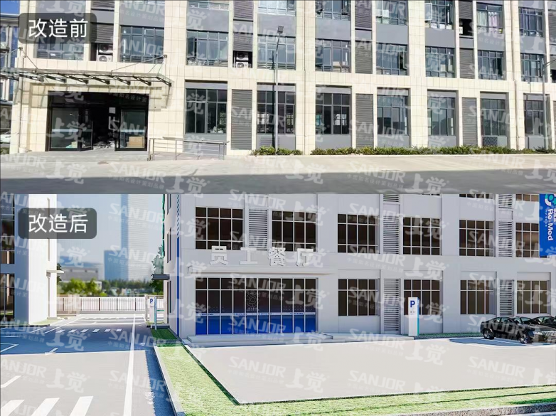 这是一场变革的力量:改造前,厂区建筑外观风格不一,色调沉闷,入口与停车场区域略显杂乱,缺乏统一的品牌标识和现代感;改造后,建筑立面焕然一新,以简洁的浅灰与白色为主调,辅以富有企业特色的“Re-Med”标识与“以质取胜 以诚致远”的核心价值观标语,整体氛围瞬间变得明亮、专业且富有秩序。停车场经过科学规划,标线清晰,车辆停放有序,极大提升了空间利用效率和观感。这正是上觉文化擅长的将品牌理念注入空间改造的直观体现。 本次厂区改造的亮点远不止于外立面的“美颜”。