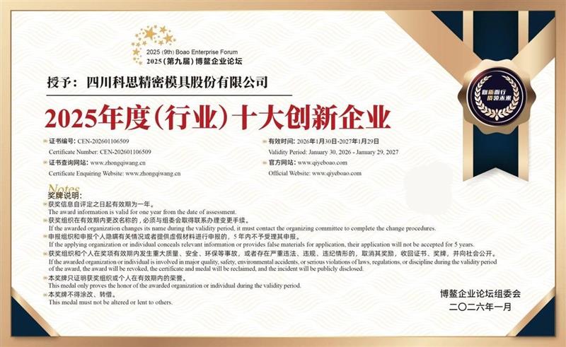 在这场中国商业智慧与创新力量的高峰盛会上,四川科思精密模具股份有限公司(以下简称“科思精密”)凭借其卓 越的创新服务能力和显著的行业影响力,脱颖而出,一举斩获两项重磅大奖:公司荣获“2025年度(行业)十大创新企业”,同时,公司董事长邓兴强先生荣膺“2025年度(行业)新质生产力优秀人物”称号。这一双料荣誉,不仅是对科思精密过往成绩的高度肯定,更是对其未来发展路径的充分认可。