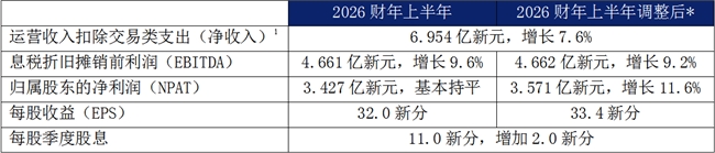 2026财年上半年净收入(不含财库收入)同比增长10.1%,至6.366亿新元(5.780亿新元);调整后的净利润同比增长11.6%,至3.571亿新元(3.201亿新元)。调整后息税折旧摊销前利润(EBITDA)增长9.2%,至4.662亿新元(4.269亿新元),调整后每股收益为33.4新分(29.9新分)。