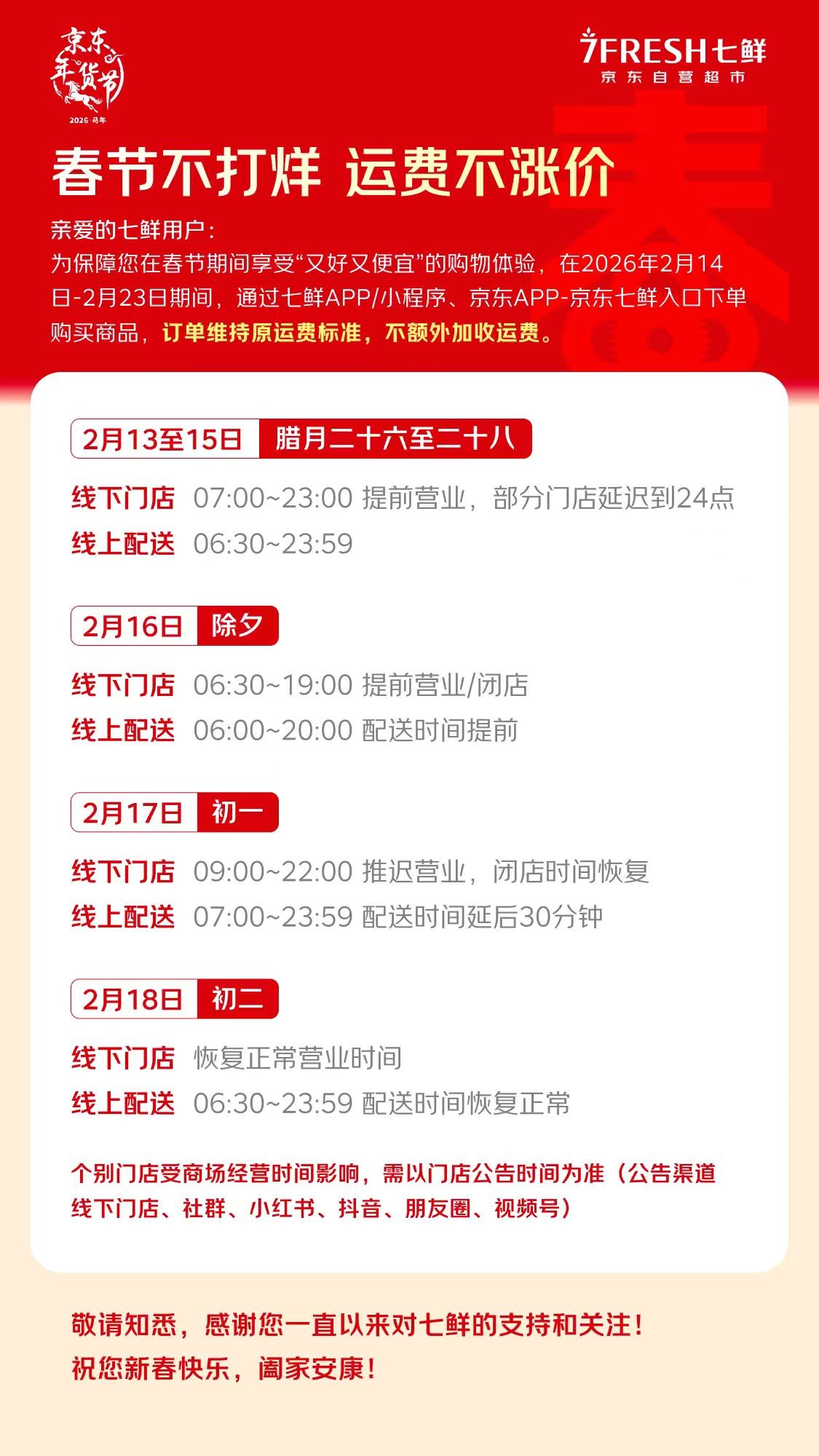 为方便消费者筹备年货,京东七鲜线下门店将于腊月廿六至腊月廿八(2月13日至2月15日)统一延长营业时间,调整为早7点至晚11点。除夕(2月16日)当天,线上渠道提前至清晨6点开启,线下门店则于6:30开门迎客,全力保障年夜饭食材的“最后一刻”采购。大年初一(2月17日)线下门店运营时间为早9点至晚10点,线上配送为早7点至晚12点。大年初二(2月18日)起,线上线下渠道均将恢复日常营业时间,确保春节期间服务不间断。