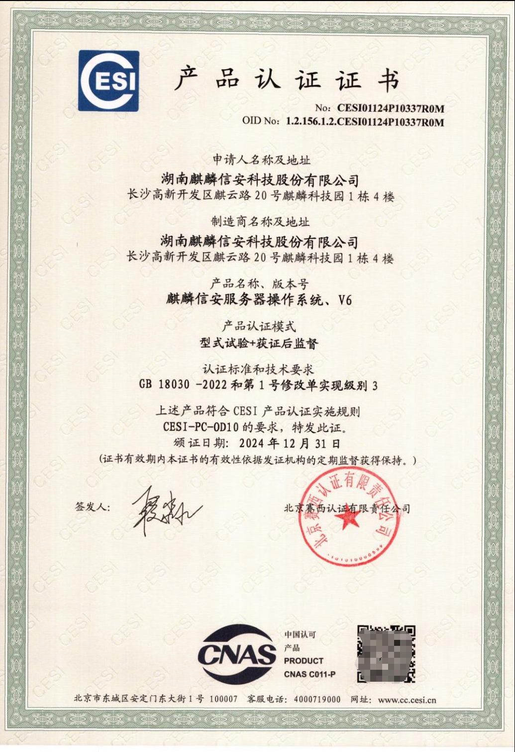 麒麟信安服务器操作系统V6顺利通过GB18030-2022《信息技术 中文编码字符集》*(3级)认证,这是继麒麟信安服务器操作系统V3、麒麟信安桌面操作系统V3后,麒麟信安再次通过此项认证的操作系统产品。