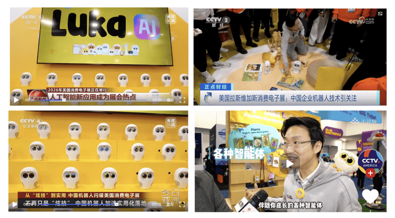 凭借创新的产品理念和卓 越的产品体验,灵宇宙连续登上CCTV1(晚间新闻)、CCTV2(正点财经)、CCTV4(中文国际)、央视北美4个频道,报道时长总计8分30秒。央视指出,“灵宇宙作为中国人工智能企业的代表,展现了AI 技术在教育陪伴场景的落地能力,玩具正在‘活过来’。”