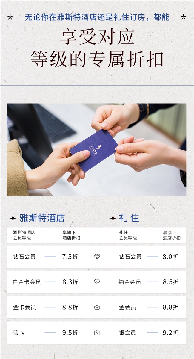 根据双方达成的协议,雅斯特现有会员等级将直接、自动匹配至“礼住”对应会籍,无需额外申请或重新累积。匹配规则清晰对应:钻石会员对应钻石,白金卡会员对应铂金,金卡会员对应金会员,蓝V会员对应银会员。双方系统将确保会员在原体系的成长记录与权益实现平稳过渡与延续。