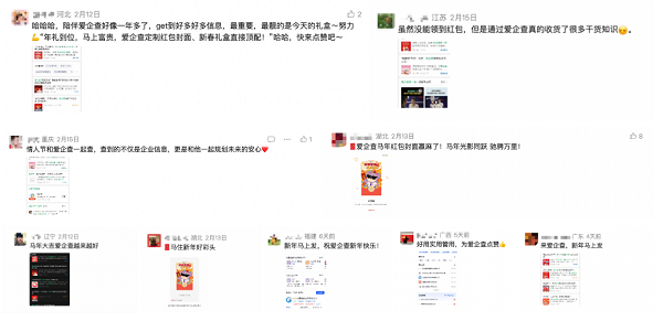 用户在参与集字互动、收获新春好礼的同时,潜移默化掌握信息核查技巧,真正实现“用产品功能守护用户安全”,让爱企查的产品融入节日生活,既增添了新春乐趣,也筑牢了用户的安全防线。活动上线后,相关话题全网收获上亿曝光,超千万用户参与其中,评论区满是用户的暖心反馈,“春节用爱企查查商家资质,消费更放心”“有了爱企查,出门游玩更安心”等留言,彰显了用户对爱企查产品的高度认可。